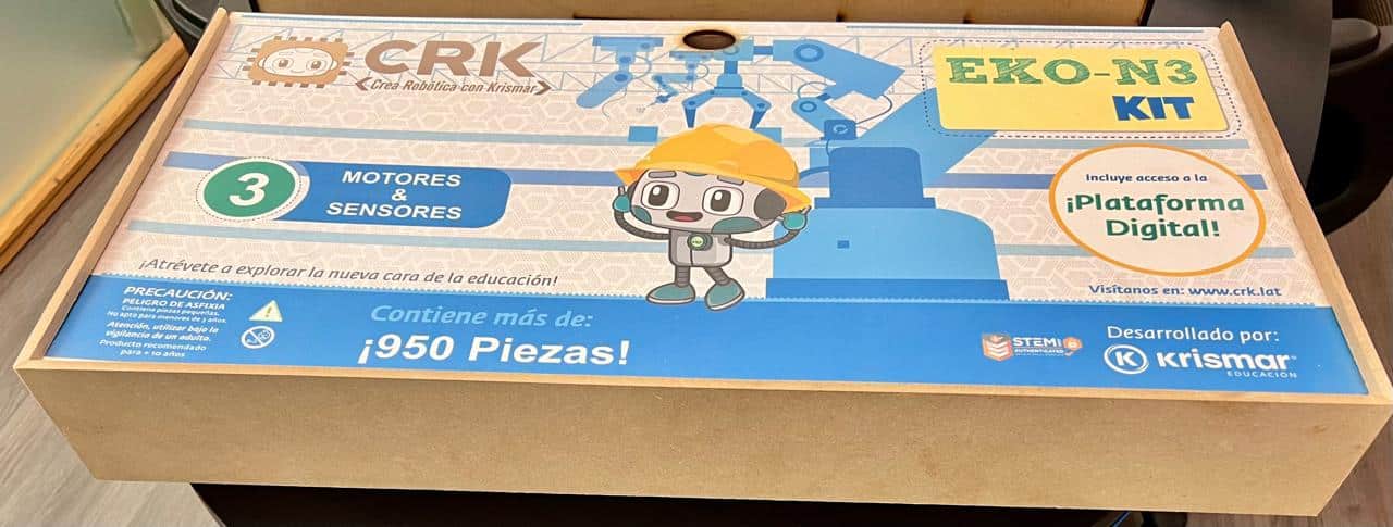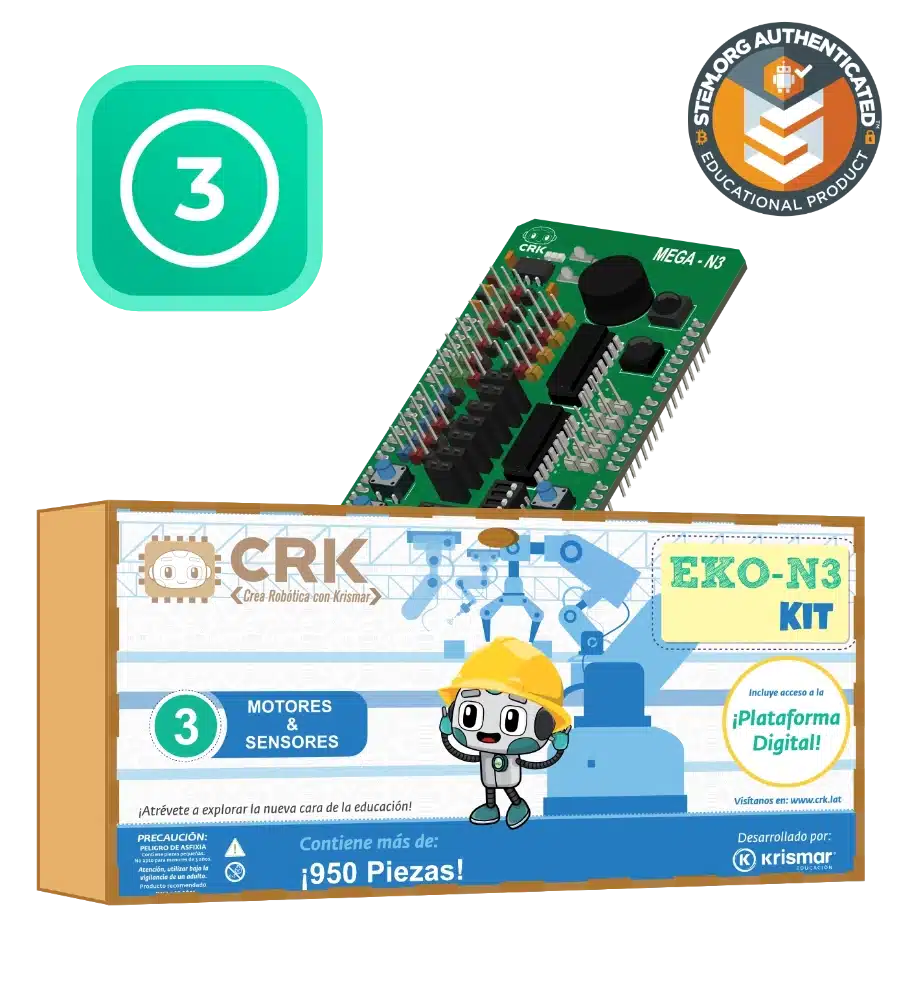 CRK Nivel 3 Motores y Sensores: es la combinación perfecta de la pedagogía con la tecnología, consiste en un kit físico y un plataforma de aprendizaje de la robótica. Nace con la idea de ser único en le mercado porque está diseñado para que el aprendiz pueda crear sus propios modelos y así conocer, experimentar y reflexionar sobre los conceptos aprendidos de los niveles 1 y 2, además de motores y sensores